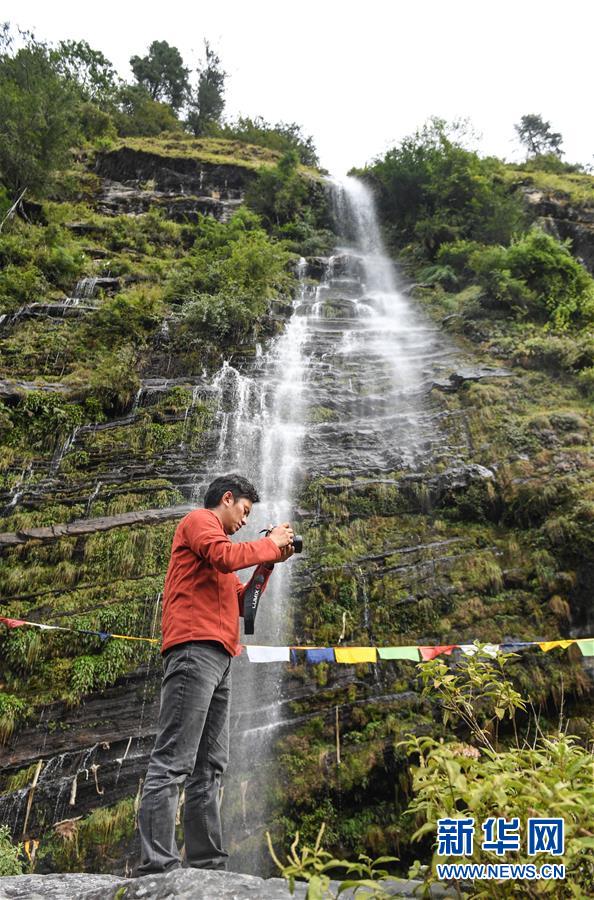 9月25日,游客在勒布溝的瀑布前拍照。