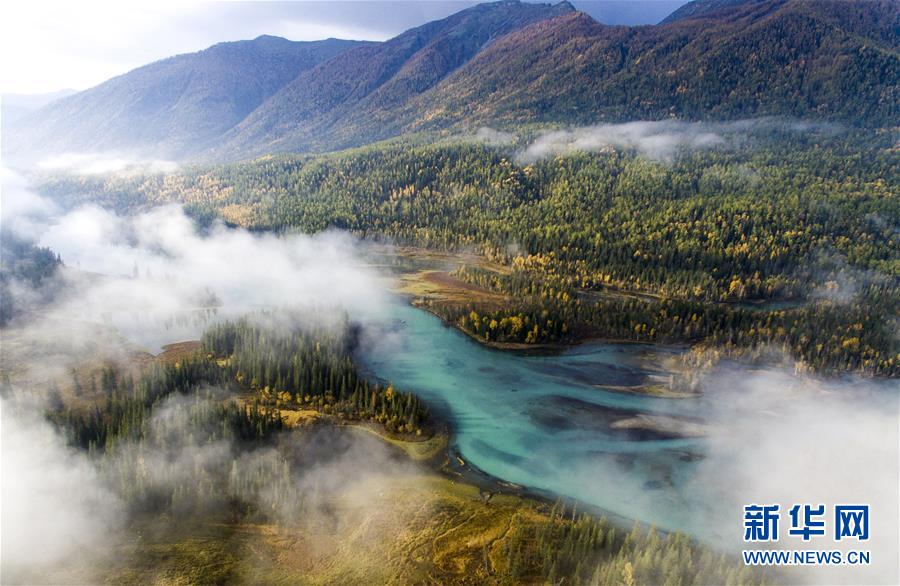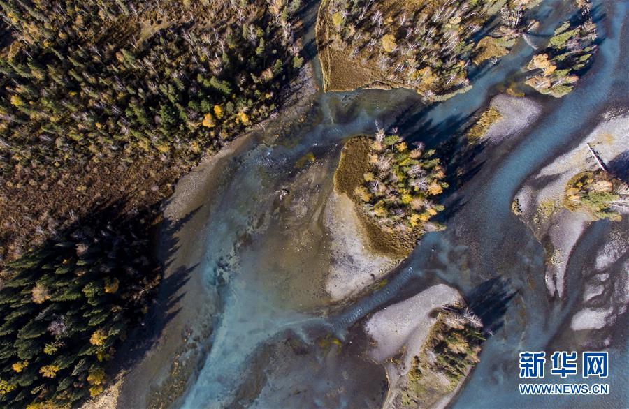 9月25日無人機拍攝的喀納斯景區(qū)風(fēng)光。 新華社記者 王菲 攝