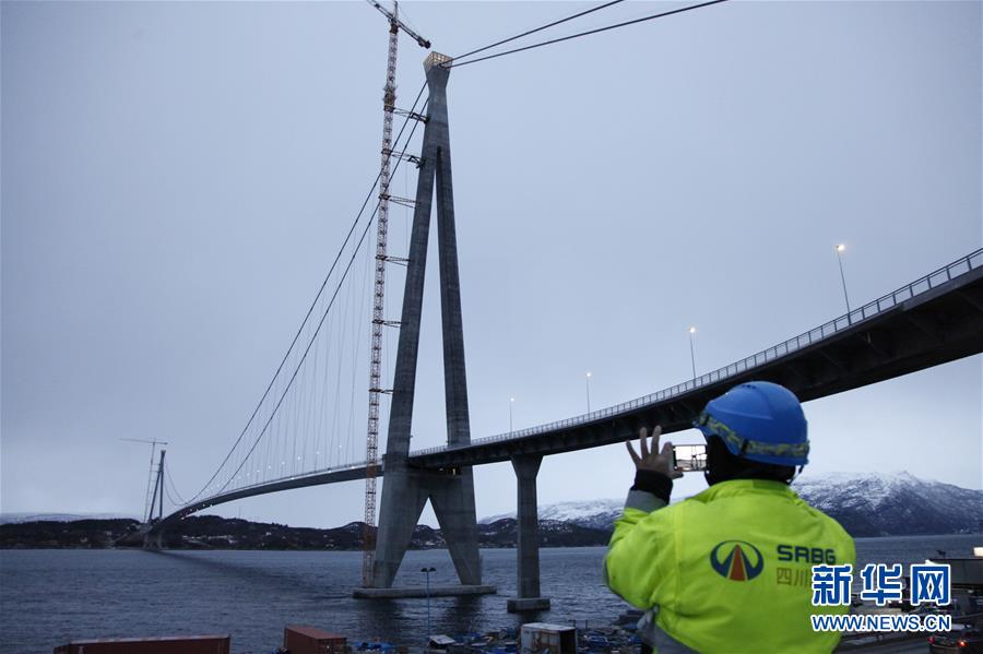 2018年12月9日,一名中國工人拍攝挪威哈羅格蘭德大橋。由中國四川公路橋梁建設(shè)集團(tuán)(四川路橋)承建的挪威第二大橋哈羅格蘭德大橋位于挪威北部港口城市納爾維克附近,橋長1533米,是北極圈內(nèi)最大跨徑懸索橋。該橋縮短了從納爾維克前往特羅姆瑟、哈爾斯塔等地的路程。新華社記者梁有昶攝
