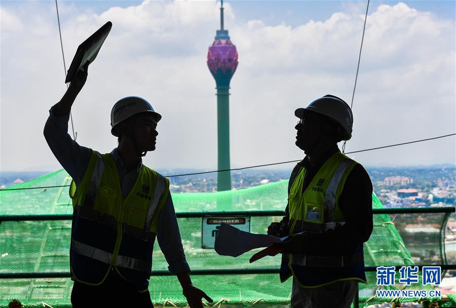 2019年4月9日,在斯里蘭卡科倫坡,中方項(xiàng)目經(jīng)理?xiàng)钭咏ㄗ螅┡c項(xiàng)目副經(jīng)理Thuwan在工地討論工作進(jìn)度,他們背后是科倫坡地標(biāo)建筑蓮花塔。Thuwan是中國中建裝飾集團(tuán)深圳裝飾公司斯里蘭卡濱江度假村項(xiàng)目的副經(jīng)理。在中方管理人員手把手的指導(dǎo)下,Thuwan從最初的一名普通商務(wù)員變成了一位優(yōu)秀的屬地化管理人員,成為了中斯雙方人員溝通的橋梁。新華社記者劉大偉攝