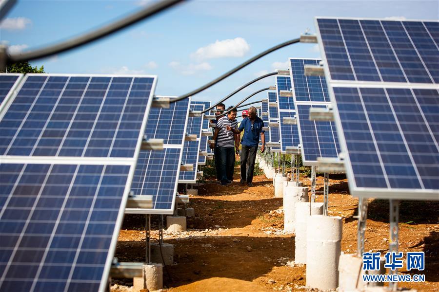 2013年11月3日,中古雙方施工人員在古巴首都哈瓦那市郊的展覽中心園區(qū)的中國援建的光伏電站內(nèi)工作。2013年11月4日,由中國北京控股集團(tuán)有限公司捐建的古巴1兆瓦光伏電站正式并網(wǎng)發(fā)電。該項(xiàng)目為中古合作共建,中方提供設(shè)備及技術(shù)指導(dǎo)。新華社記者劉彬攝