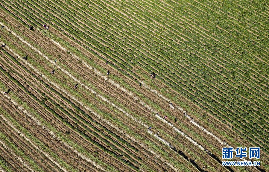 9月30日,寧夏吳忠市紅寺堡區(qū)馬渠生態(tài)移民安置區(qū)的農(nóng)民在蘿卜地里勞作(無人機(jī)拍攝)。 新華社記者 馮開華 攝