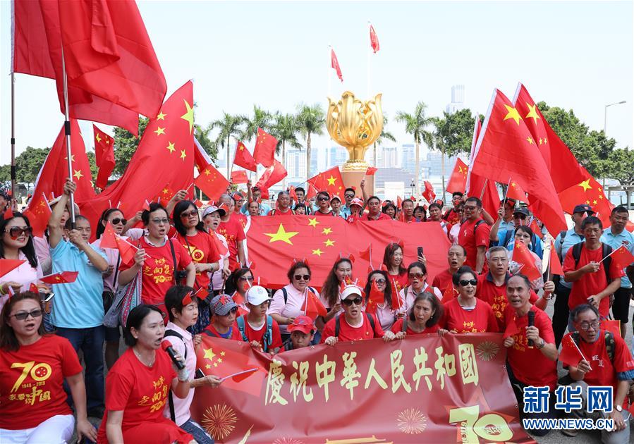 10月1日,香港市民在金紫荊廣場高唱愛國歌曲。當(dāng)日是國慶節(jié),全國各地的人們用各種方式歡度節(jié)日。新華社記者 吳曉初 攝