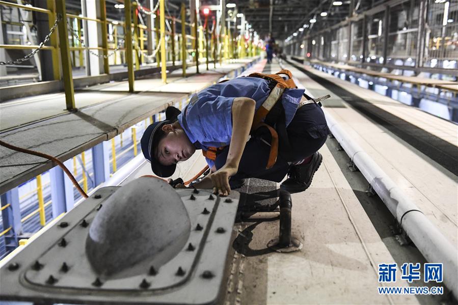 “動車醫(yī)生”在對車頂?shù)腇M天線進(jìn)行檢查(10月2日攝)。 新華社記者 曹祎銘 攝