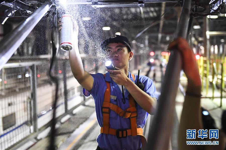 “動車醫(yī)生”用檢漏劑對受電弓升弓氣囊進行檢查(10月2日攝)。 新華社記者 曹祎銘 攝