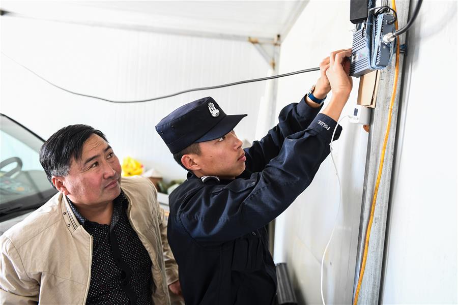 9月25日,內(nèi)蒙古自治區(qū)額濟納旗算井子邊境派出所民警崔現(xiàn)浦(右)在幫牧民敖其爾修理家用電器。新華社記者劉磊攝