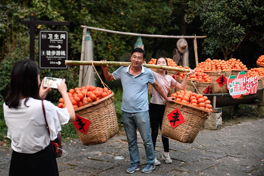10月3日,游客在西溪國家濕地公園挑起道具“柿子”留影。據了解,西溪濕地內共有柿子樹7000多棵,正值豐收的季節(jié)。 當日是國慶假期第三天,大批游客來到位于杭州的西溪國家濕地公園游玩,在江南詩意的環(huán)境中休閑度假。 新華社記者 黃宗治 攝