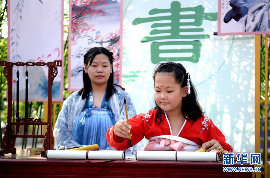 10月3日,在河北邯鄲市磁縣方特主題公園內(nèi),游客在練習(xí)書(shū)法。 當(dāng)日是國(guó)慶假期第三天,人們紛紛走出家門(mén),樂(lè)享假期。 新華社記者 王曉 攝