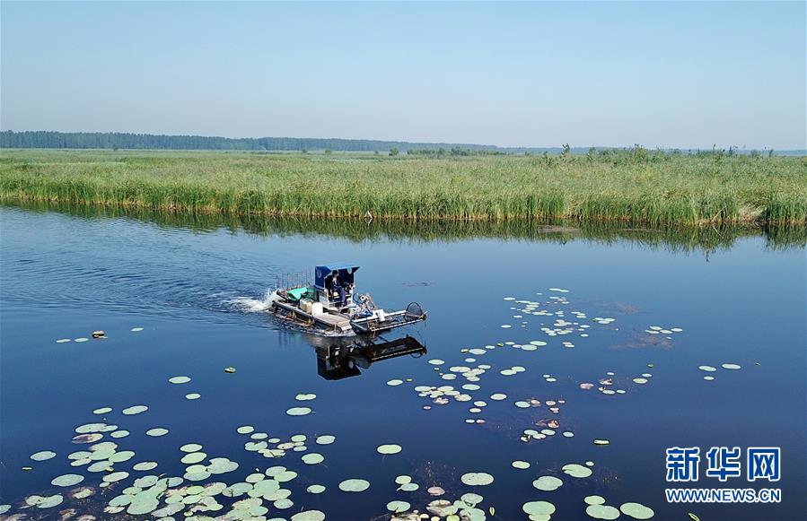 一艘打撈船在白洋淀景區(qū)內清理漂浮物(8月31日無人機拍攝)。新華社記者牟宇攝