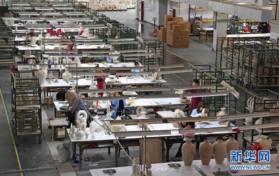 在江西景德鎮(zhèn)法藍(lán)瓷實(shí)業(yè)有限公司,工人們在陶瓷生產(chǎn)車間工作(2017年4月8日攝)。新華社記者 萬象 攝