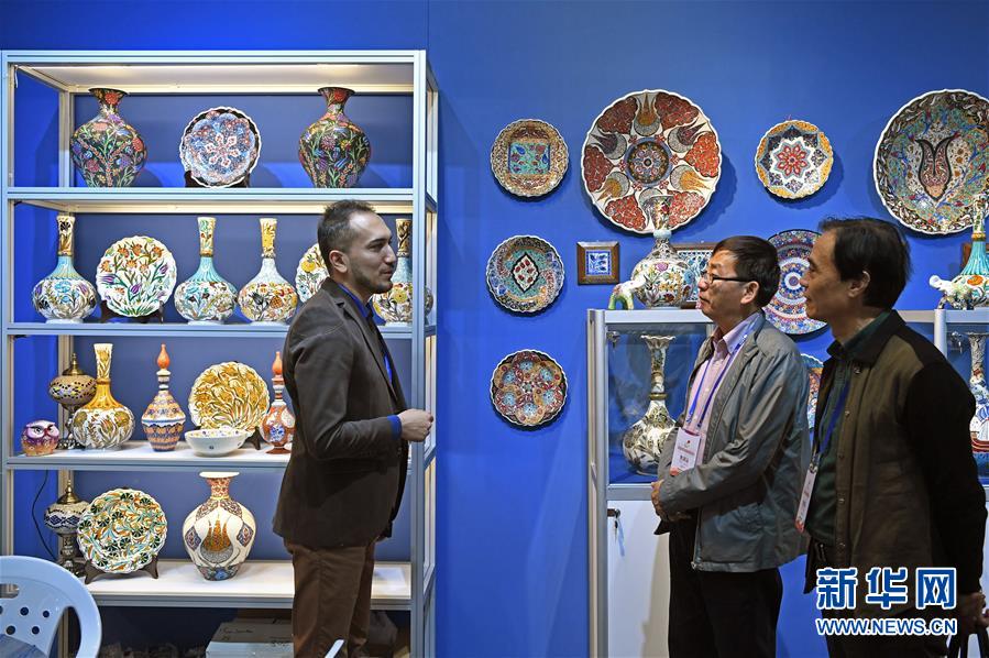 在中國景德鎮(zhèn)國際陶瓷博覽會(huì)的現(xiàn)場,來自土耳其的參展商(左一)與參觀者交流(2018年10月18日攝)。新華社記者 萬象 攝