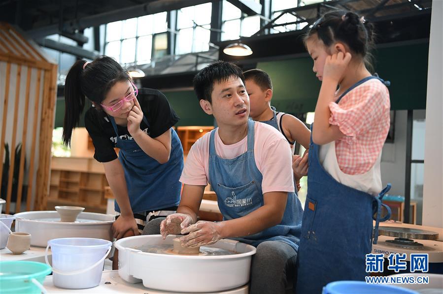 在江西景德鎮(zhèn)陶溪川文創(chuàng)街區(qū)的陶公塾實(shí)訓(xùn)基地,孩子們在老師(中)的指導(dǎo)下制作陶藝作品(7月26日攝)。新華社記者 萬象 攝