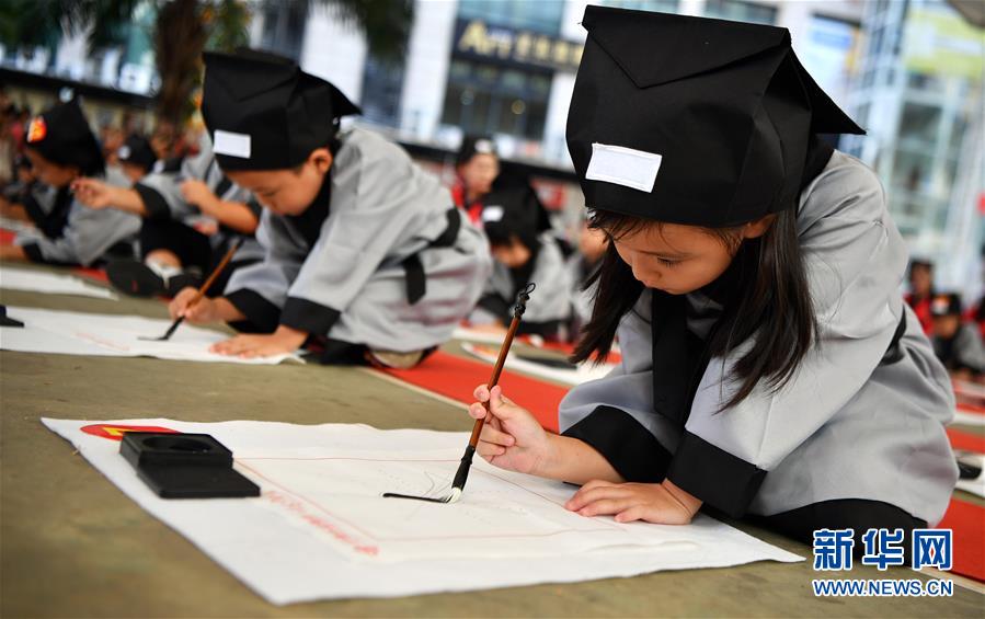 10月13日,參加儀式的小朋友在書(shū)寫(xiě)“人”字。當(dāng)日,??诤?huà)少兒藝術(shù)中心為500名小朋友舉行“開(kāi)筆禮”,通過(guò)“點(diǎn)朱砂,啟智慧”“習(xí)書(shū)法,描人字”等儀式讓孩子們體驗(yàn)中國(guó)傳統(tǒng)文化。新華社記者郭程攝