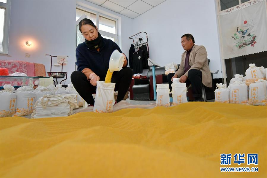 在奪火鄉(xiāng)高谷堆村,村民在打包加工好的小米(10月14日攝)。