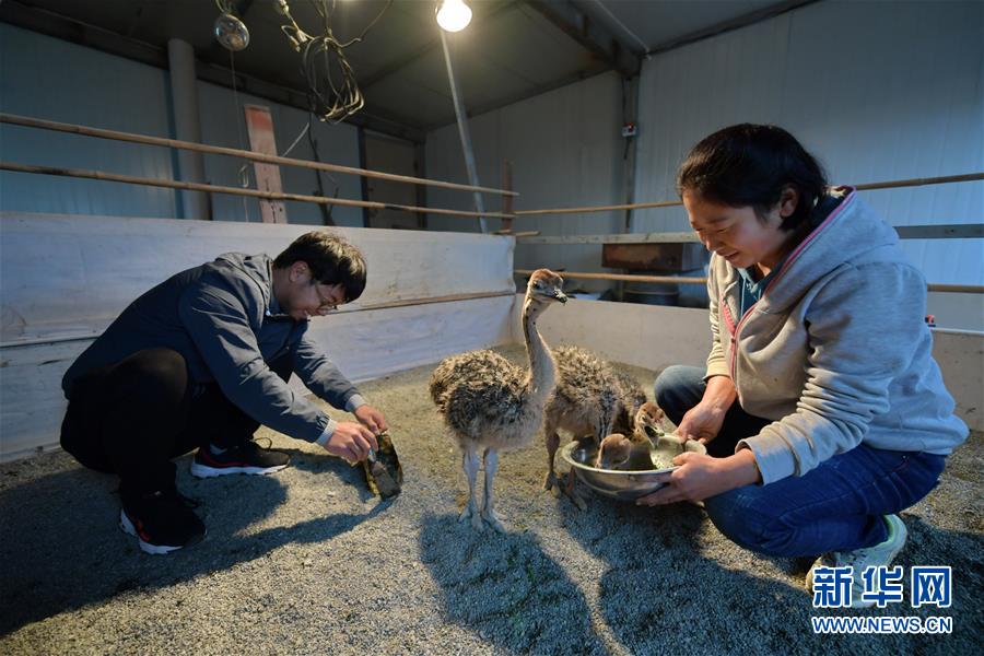 村民許俊鵬和妻子在照料小鴕鳥(10月14日攝)。2017年初,高谷堆村貧困戶許俊鵬一家在扶貧干部的幫助下開始嘗試養(yǎng)殖鴕鳥創(chuàng)收。目前,許俊鵬一家已建成擁有20余只鴕鳥的養(yǎng)殖基地,平均年收入近4萬元。 新華社記者 曹陽 攝