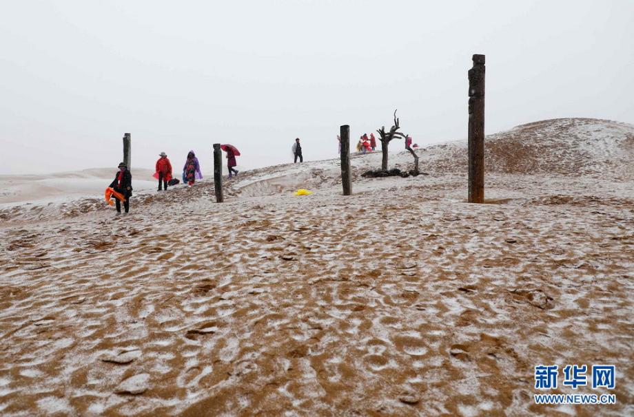 10月15日,游客在寧夏中衛(wèi)市沙坡頭景區(qū)欣賞沙漠雪景。新華網(wǎng)杜文杰攝