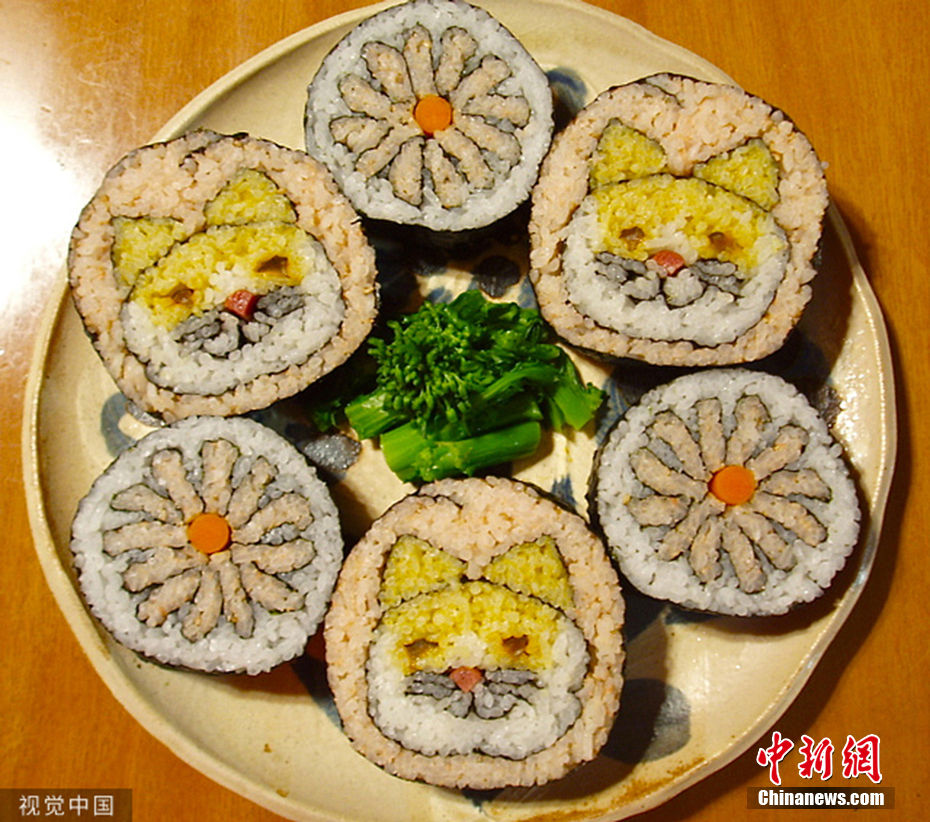 日本壽司廚師利用著色大米和海藻,制作出了貓咪、子宮中的嬰兒、美人魚以及名畫。奇妙的是,不把壽司切成片,就不知道她制作的究竟是什么圖案。圖片來源:視覺中國(guó)