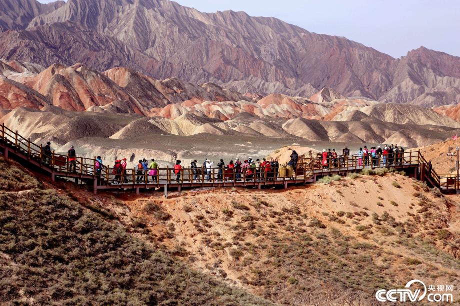 央視網(wǎng)消息:2019年10月15日,金秋時(shí)節(jié),位于甘肅省張掖市臨澤縣的七彩丹霞景區(qū)進(jìn)入旅游旺季,吸引眾多游人紛至沓來(lái)。張掖七彩丹霞景區(qū),分布面積約50公里,是中國(guó)北方干旱地區(qū)發(fā)育最典型的丹霞地貌。在方圓數(shù)十平方公里的范圍內(nèi),隨處可見有紅、黃、橙、綠、白等多種鮮艷的色塊或線條,把一座座山峰,一條條溝壑,裝點(diǎn)成一幅幅絢麗多姿、燦爛奪目的畫圖。圖片來(lái)源:視覺(jué)中國(guó)
