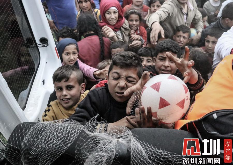 當(dāng)?shù)貢r(shí)間2018年3月18日,敘利亞阿勒頗,敘利亞難民領(lǐng)取災(zāi)害和應(yīng)急管理機(jī)構(gòu)提供的糧食救援。1月20日,土耳其發(fā)動(dòng)針對敘利亞阿夫林地區(qū)庫爾德人的橄欖枝行動(dòng),阿勒頗諸多村鎮(zhèn)被清理,當(dāng)?shù)鼐用窦毙枞粘I罹仍?/p>