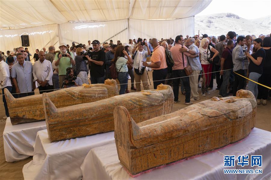 這是10月19日在埃及盧克索拍攝的近期發(fā)掘出的棺槨。 埃及文物部19日在南部城市盧克索舉行的新聞發(fā)布會上宣布,埃及考古隊近期發(fā)掘出30具3000年前的木質棺槨。 新華社記者 李碧念 攝