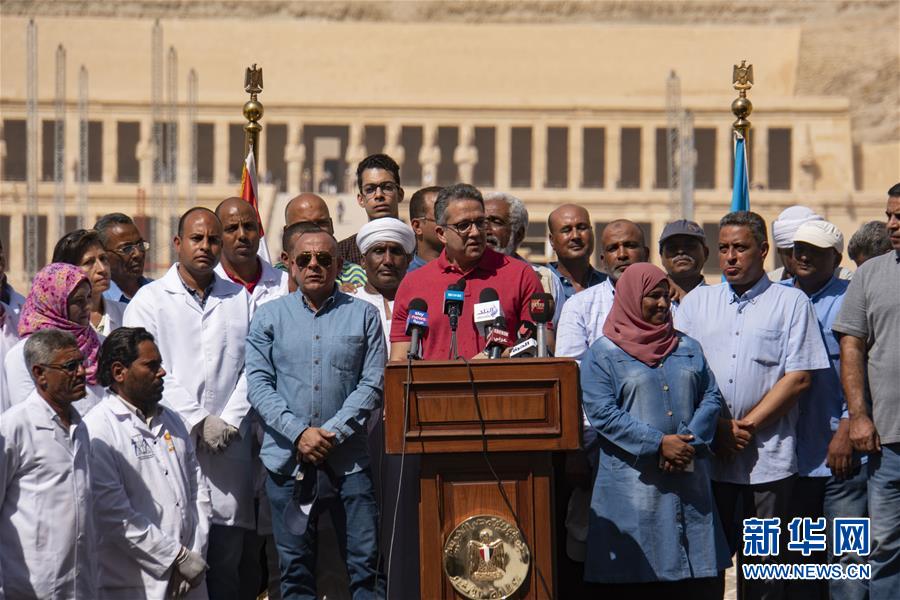 10月19日,在埃及盧克索,埃及文物部長(zhǎng)哈立德·阿納尼在新聞發(fā)布會(huì)上講話。 埃及文物部19日在南部城市盧克索舉行的新聞發(fā)布會(huì)上宣布,埃及考古隊(duì)近期發(fā)掘出30具3000年前的木質(zhì)棺槨。 新華社記者 李碧念 攝