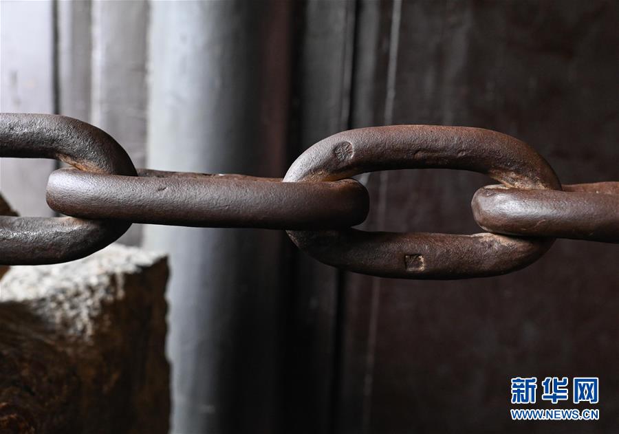 瀘定橋的鎖鏈總共有12164個鐵環(huán)相扣,現(xiàn)今仍可在鐵環(huán)上看到一些獨特的標記(6月27日攝)。 新華社記者 江宏景 攝