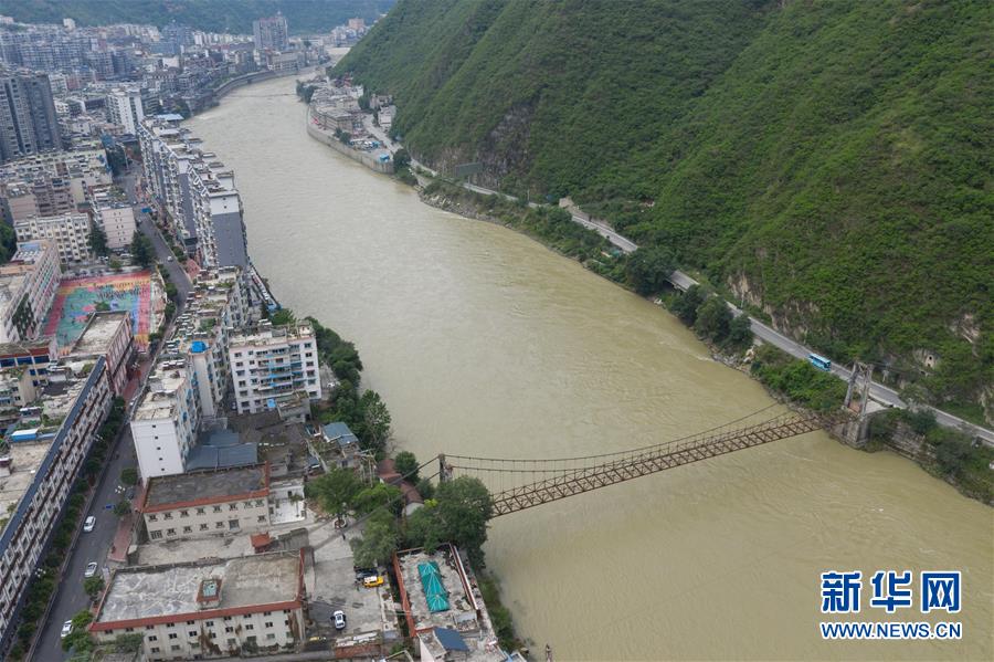這是大渡河的鋼索汽車吊橋(6月27日無人機拍攝)。 新華社記者 江宏景 攝