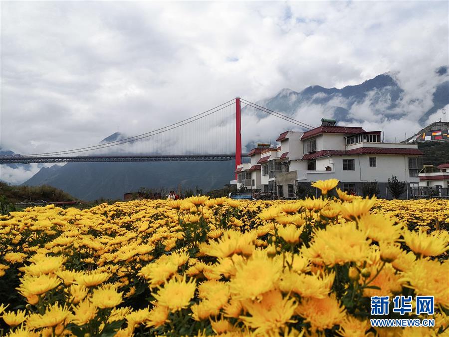 雅康高速瀘定大渡河大橋下的瀘橋鎮(zhèn)咱里村試種的金絲黃菊迎來豐收(10月16日攝)。 新華社記者 江宏景 攝