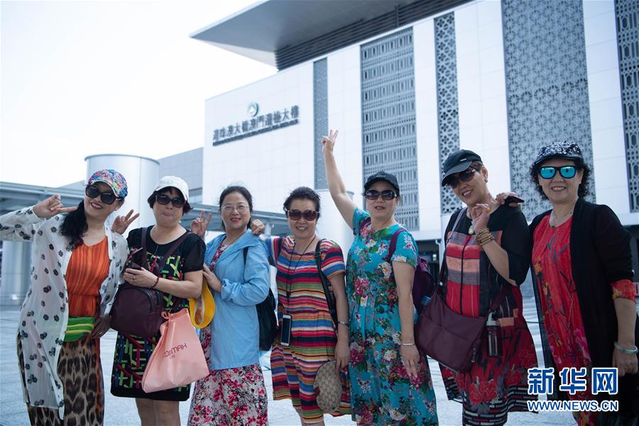 10月24日上午,旅客在港珠澳大橋澳門邊檢大樓附近合影。2018年10月23日,港珠澳大橋正式開通。新華社記者張金加攝