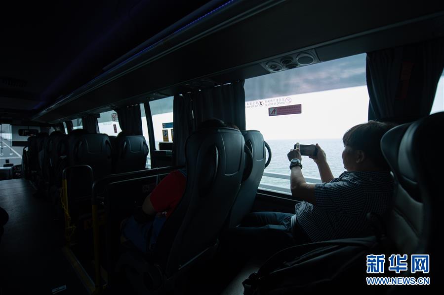 10月24日上午,一名乘客在往香港方向的港珠澳大橋穿梭巴士上拍照。2018年10月23日,港珠澳大橋正式開通。新華社記者張金加攝