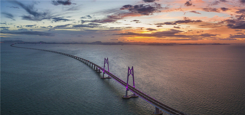 2018年7月18日,廣東珠海,滿(mǎn)天紅霞,亮燈后的港珠澳大橋跨立在伶仃洋上,進(jìn)入通車(chē)前的最后準(zhǔn)備。張由瓊/視覺(jué)中國(guó)