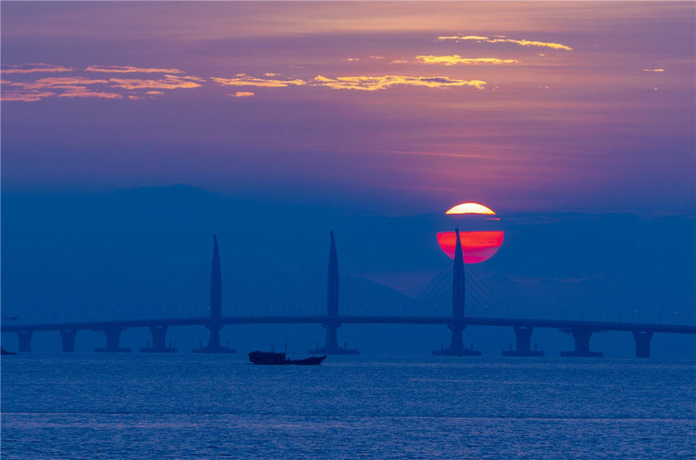 2018年10月22日早晨,從廣東珠海市的情侶路向東眺望,一輪紅日從東方冉冉升起,將港珠澳大橋映射得格外迷人?!俺壒こ獭备壑榘拇髽?qū)⒂?4日上午9時(shí)正式通車。張煒(香港分社)/中新社/視覺中國