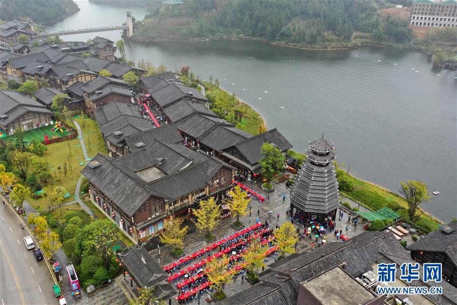 丹寨縣萬達小鎮(zhèn)萬人長桌宴(10月26日無人機拍攝)。