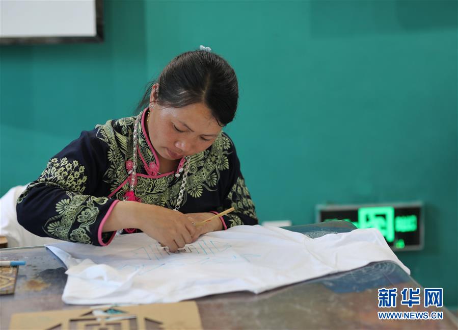 7月2日,苗族婦女王尖其在丹寨萬達(dá)小鎮(zhèn)展示苗族蠟染技藝。新華社記者歐東衢攝