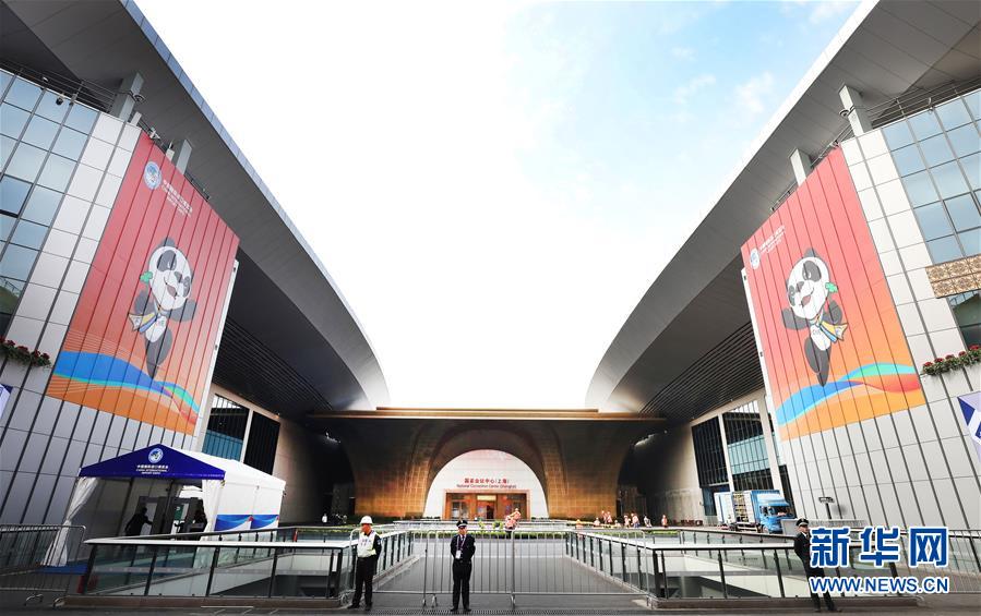 10月25日,位于國展中心內(nèi)的國家會議中心入口處張貼了醒目的進博會吉祥物熊貓進寶裝飾。 新華社記者 方喆攝