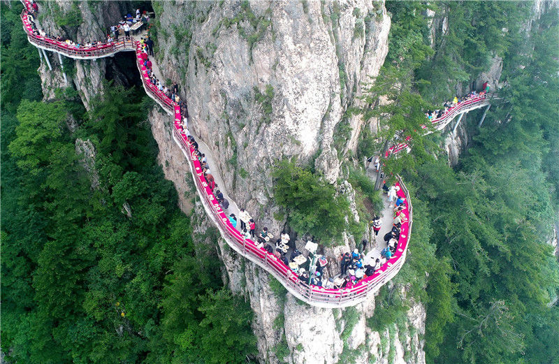 2018年7月8日,河南洛陽老君山舉行觀海避暑節(jié),在半山腰海拔2000米的懸崖棧道上安排了一場“云海盛宴”,設(shè)下免費(fèi)午餐,讓民眾免費(fèi)品嘗蘑菇山珍、大蝦、時令水果、新鮮果汁,精美點(diǎn)心等。DF/視覺中國