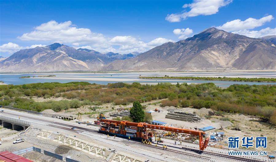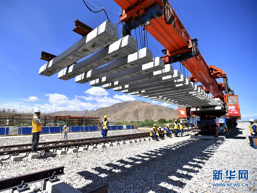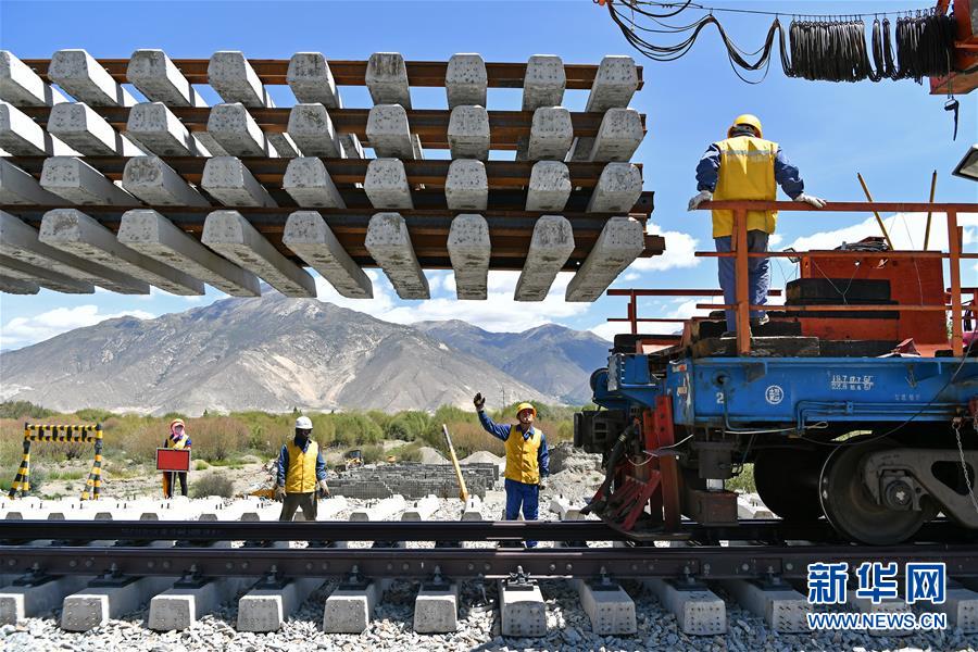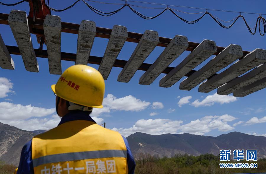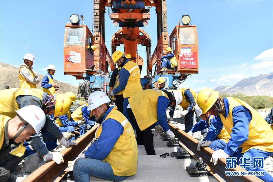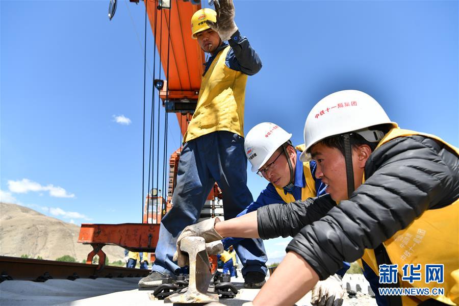 6月6日,負責鋪軌的中鐵十一局集團的建設者在現(xiàn)場作業(yè)。新華社記者普布扎西攝
