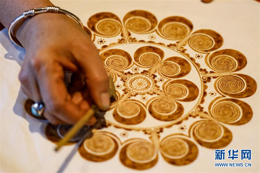 10月29日,楊芳在位于丹寨萬達小鎮(zhèn)內的工作室內繪制蠟染圖案。新華社記者 歐東衢 攝