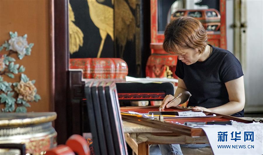 北京金漆鑲嵌有限責(zé)任公司工藝美術(shù)大師胡昕在創(chuàng)作漆畫(huà)屏風(fēng)(9月19日攝)。新華社記者李欣攝