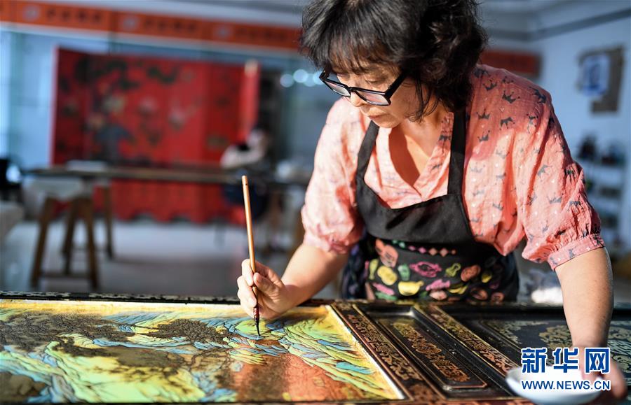 北京金漆鑲嵌有限責(zé)任公司工藝美術(shù)大師胡昕在創(chuàng)作漆畫(huà)屏風(fēng)(9月19日攝)。新華社記者李欣攝