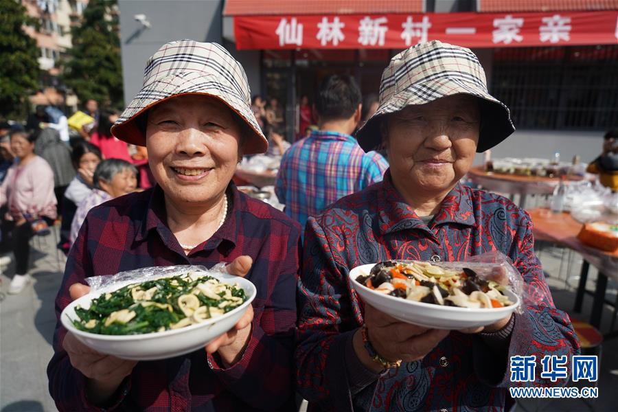 11月2日,南京仙林街道仙林新村社區(qū)居民呂余鳳(左)和高翠華展示自己做的菜。 新華社記者 季春鵬 攝
