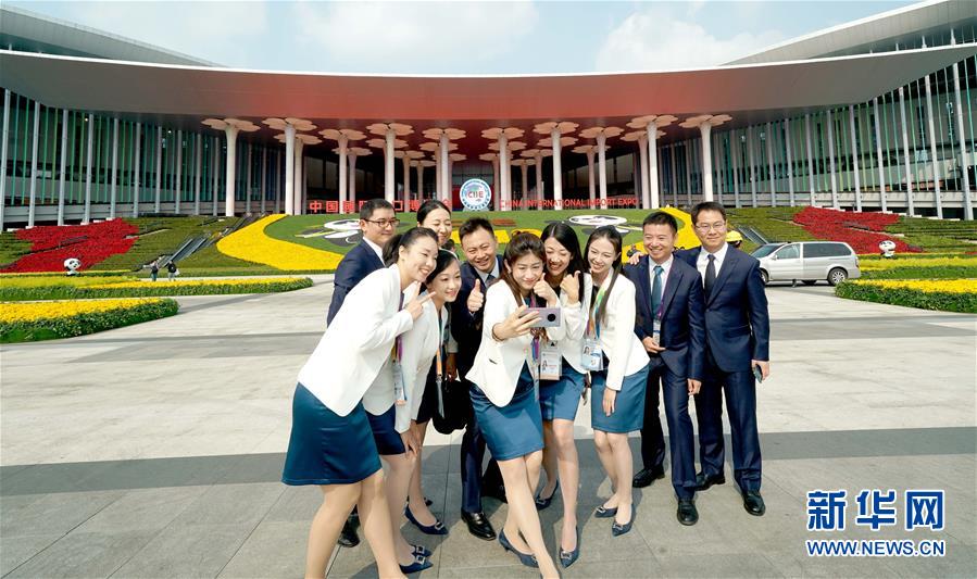 11月4日,第二屆中國(guó)國(guó)際進(jìn)口博覽會(huì)中國(guó)館的工作人員在國(guó)家會(huì)展中心(上海)南廣場(chǎng)合影。新華社記者陳建力攝