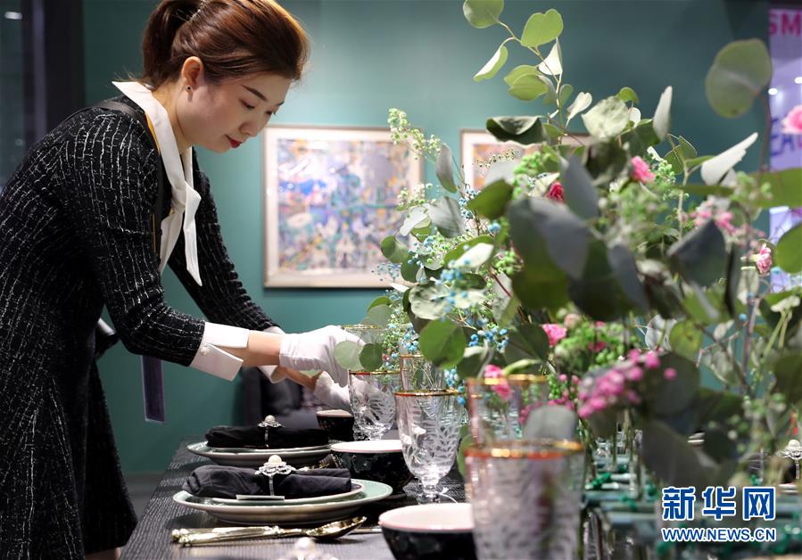 11月5日,在第二屆進(jìn)博會品質(zhì)生活展區(qū),工作人員在一家丹麥家居產(chǎn)品的展臺前忙碌。新華社記者劉穎攝