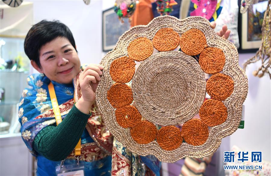 在第二屆進(jìn)博會品質(zhì)生活展區(qū),孟加拉國達(dá)達(dá)公司工作人員展示黃麻制品(11月8日攝)。新華社記者范培珅攝