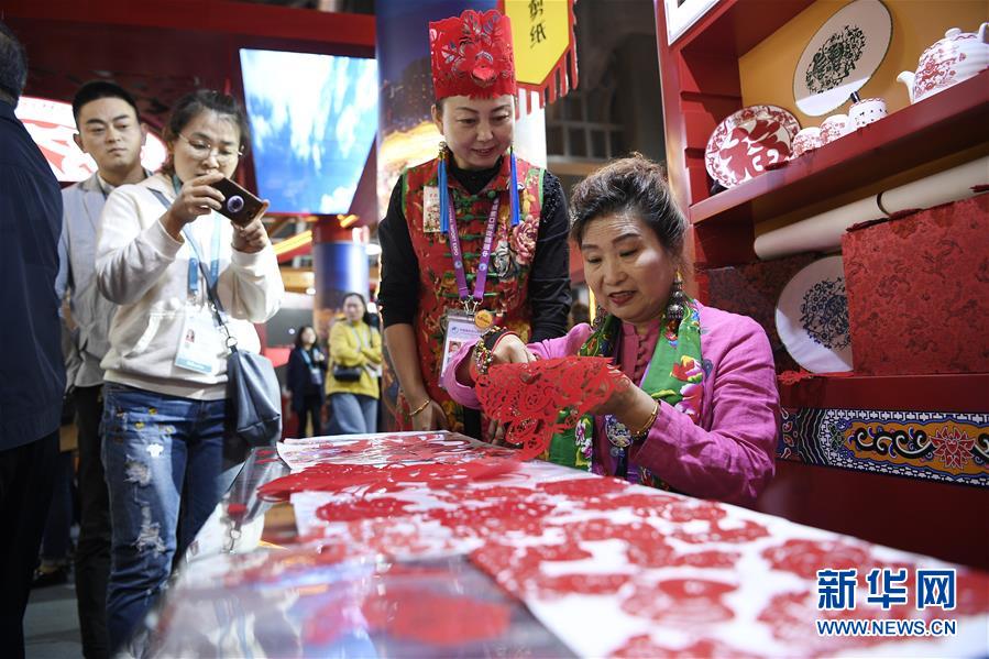 非遺傳承人田亞莉(右一)在第二屆進(jìn)博會陜西非遺展區(qū)展示剪紙技藝(11月8日攝)。新華社記者王鵬攝