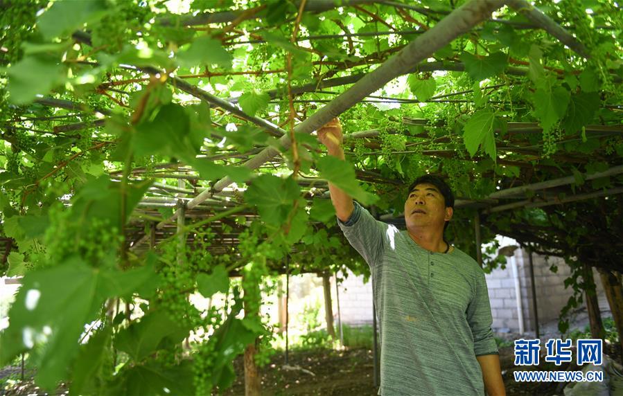 建廠生產(chǎn)并注冊(cè)“丁德良”牌干紅葡萄酒品牌的魯仁弟介紹他家里一棵樹齡超過百年的葡萄樹(6月3日攝)。新華社記者晉美多吉攝