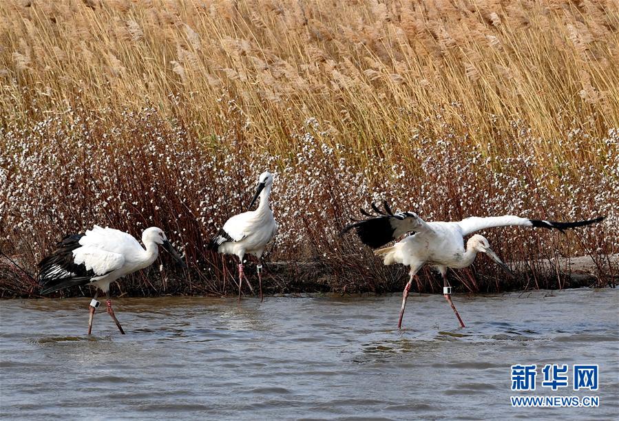 這是在樂(lè)亭縣野生動(dòng)物保護(hù)協(xié)會(huì)大清河鳥(niǎo)類救助站放飛回歸大自然的三只國(guó)家一級(jí)保護(hù)動(dòng)物東方白鸛(11月16日攝)。新華社記者楊世堯攝
