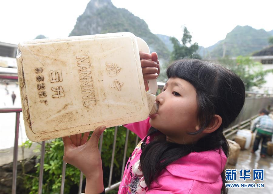 在廣西大化瑤族自治縣板升鄉(xiāng)八好小學(xué),一名學(xué)生喝水桶里的雨水(2014年11月24日攝)。八好小學(xué)有400多名學(xué)生,曾僅有一個(gè)不足100立方米的水柜,用于收集儲(chǔ)存樓頂?shù)挠晁?,學(xué)生需定期定量用水。遇到長(zhǎng)時(shí)間不下雨,學(xué)校需要到鄉(xiāng)政府所在地運(yùn)水。如今,學(xué)校修建了5個(gè)大水柜,并從兩公里外引泉水到校園,飲水難問題得到解決。新華社記者黃孝邦攝