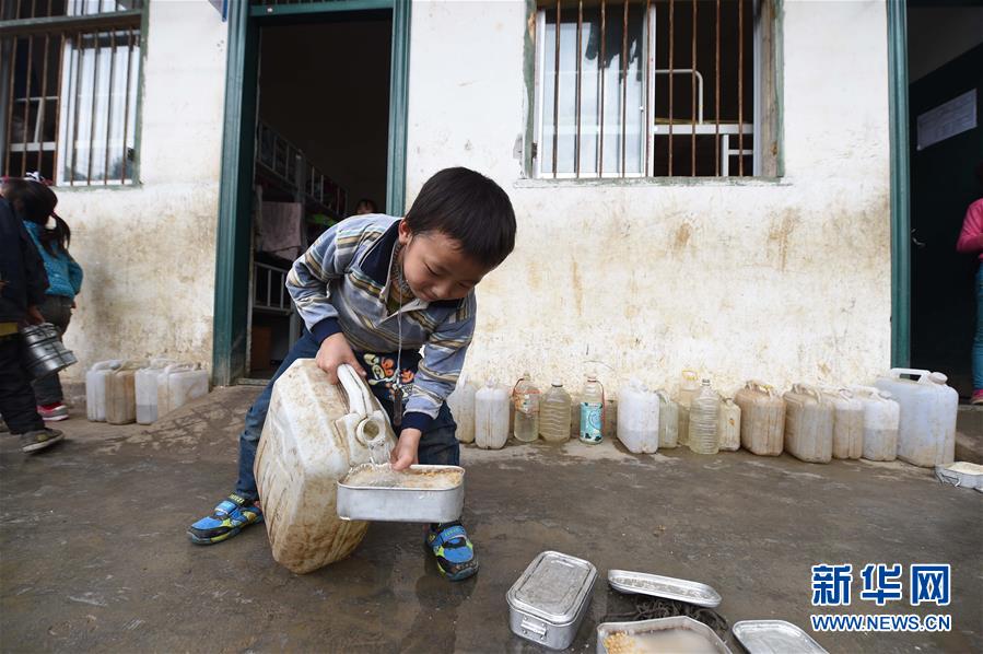 在廣西大化瑤族自治縣板升鄉(xiāng)八好小學(xué),一名學(xué)生用儲(chǔ)備在水桶里的雨水淘米煮飯(2014年11月24日攝)。新華社記者黃孝邦攝