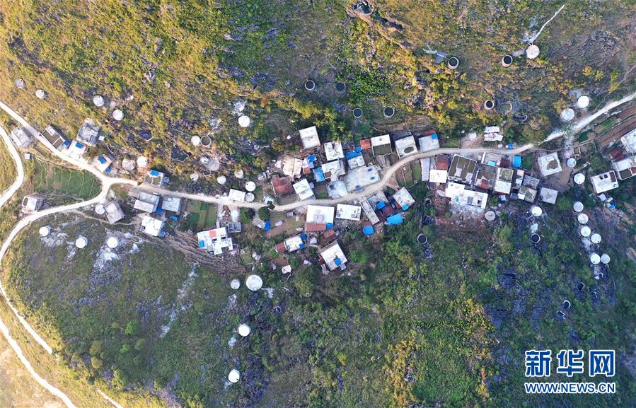 廣西大化瑤族自治縣七百弄鄉(xiāng)弄騰村群眾的家庭水柜分布在房前屋后(11月9日無人機拍攝)。新華社記者黃孝邦攝